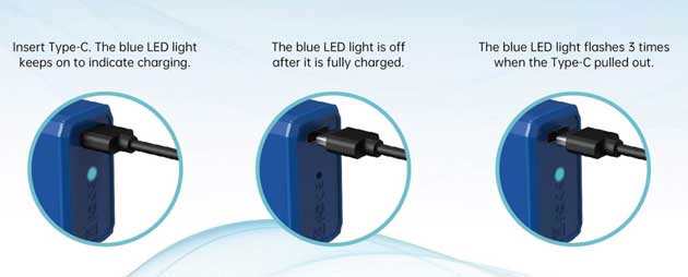 A: The device features a Type-C charging port, allowing for quick and easy recharging.
